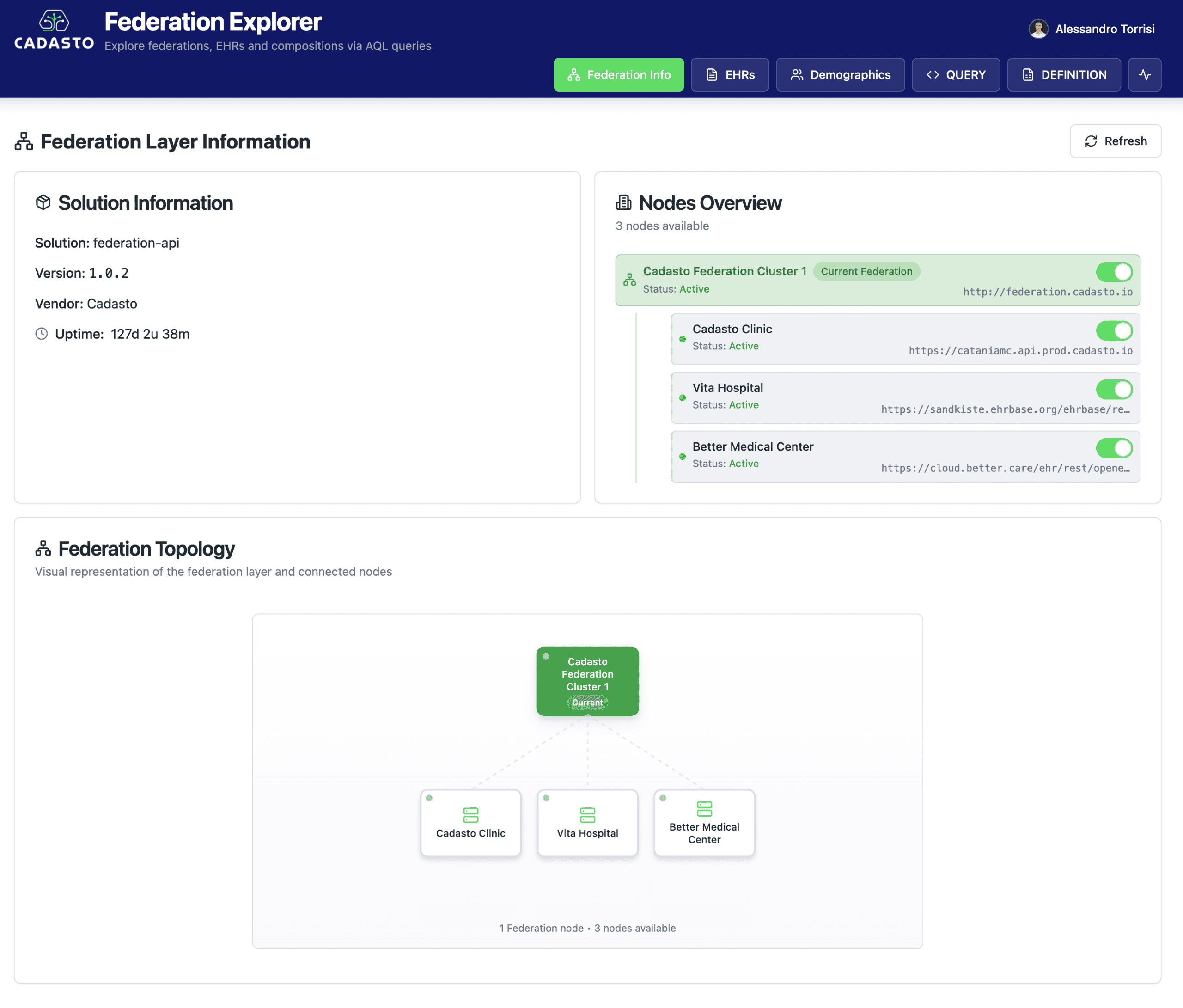 Cadasto’s main offering is, of course, an ‘open data platform’ also often referred to as a ‘clinical data repository’ (CDR). Such a platform is, in very basic terms, a standardised environment for data to live in. This data is modelled, in our case according to the openEHR standard, to ensure optimal reusability and interoperability. A federation is something altogether different. It is the connective tissue that sits above multiple of such environments.